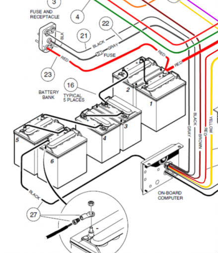 The image below is a 48 volt Club Car golf cart wiring diagram. Allow me to orient you to what you are seeing. You can clearly see three sets of batteries each of which is 8 volts. The batteries are numbered 1 thru 6 and connected in series (positive to negative) to create the needed 48V output. In the lower right corner you will see all the wiring running through the on-board computer. The upper left corner depicts the backside of the charge receptacle.
