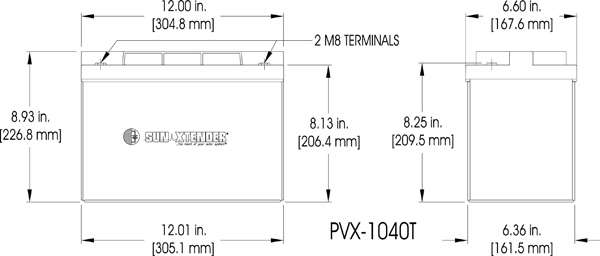 The Sun Xtender PVX-1040T is a Group 27 sized 12-Volt deep cycle AGM battery with 104 amp hour capacity. The non-spillable construction allows the battery to be used upright or on its end or side and the maintenance free AGM design means no water replenishment ever. This battery comes with a 1 year free replacement warranty.